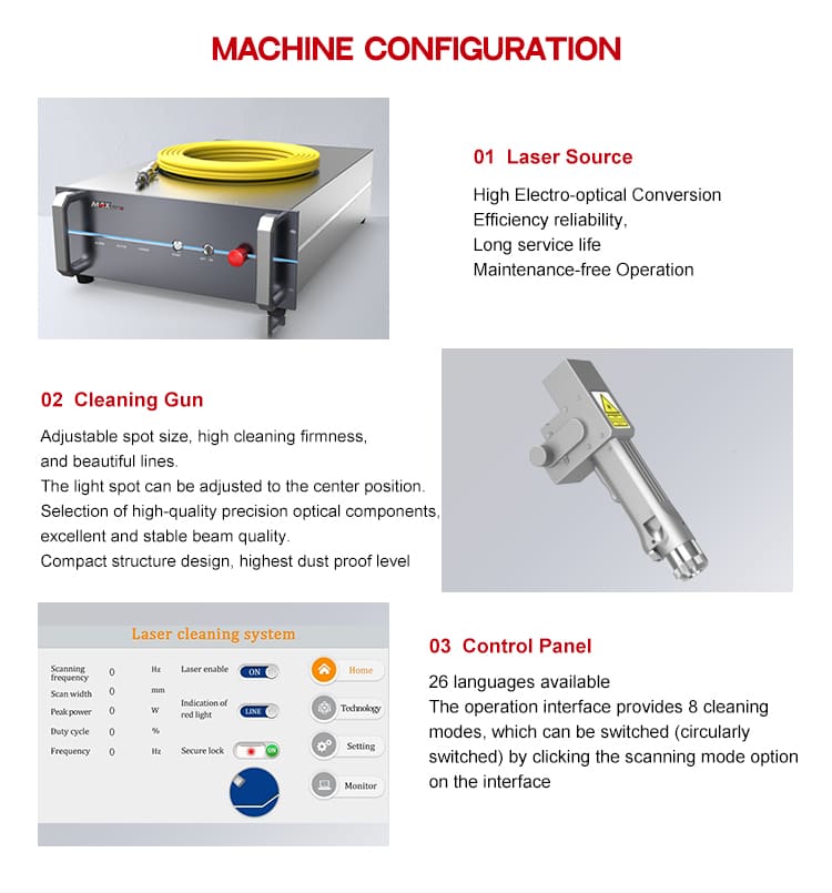 Kot brezkontaktni laserski čistilni stroj ne poškoduje substrata delov, brez potrošnega materiala, varčuje z energijo in varuje okolje ter lahko učinkovito odstrani smolo, olje, madeže, umazanijo/rje, premaze, obloge in barve s površine obdelovanca, da izpolni zahteve po čiščenju pri kompleksnem modeliranju in natančnem pozicioniranju na področju industrijske obdelave, doseže višjo stopnjo čistosti učinka čiščenja in proizvodne koristi ob nižjih skupnih stroških.
